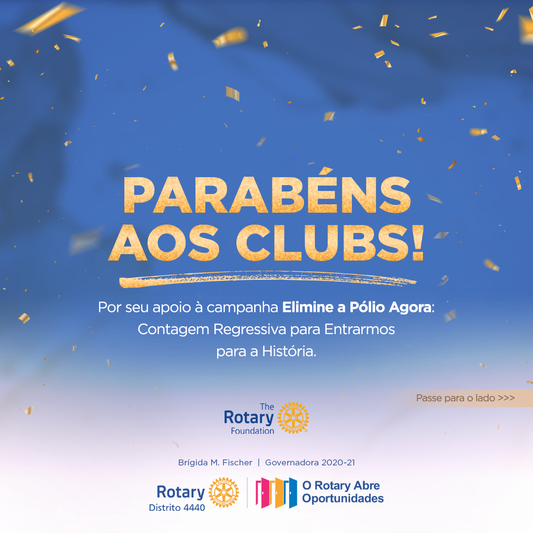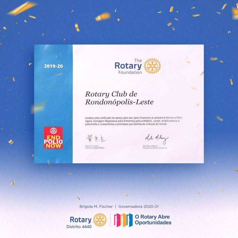 Parabéns aos clubes de Lucas do Rio Verde e Rondonópolis pelo certificado de Apoio Financeiro à campanha “Elimine a Pólio Agora: Contagem Regressiva Para Entramos para a História”, ano 2019-20.