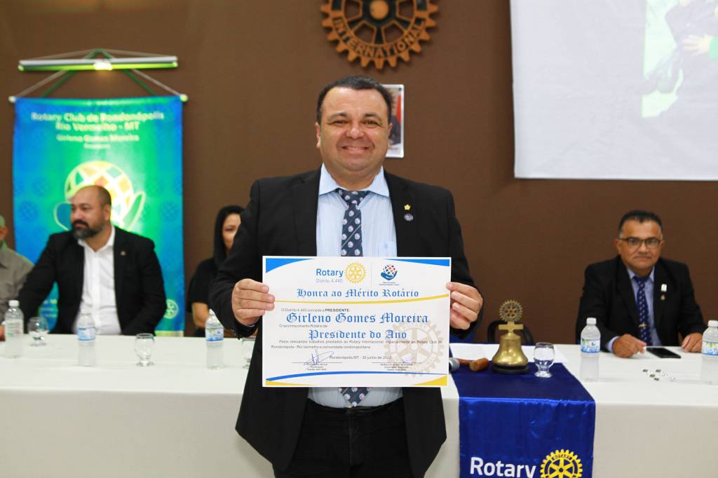 Tenho a grata satisfação de ter conhecido o Rotary Internacional atraves do meu padrinho Girleno Gomes Moreira, pessoa de quem eu agradeço imensamente. Trata-se realmente de uma das maiores instituições de prestação de serviços humanitários do mundo, que tem hoje 117 anos. Me sinto honrado tambem de receber do  meu clube a aprovação por unanimidade dos companheiros para estar na Presidencia neste ano que começa 2022-2023.