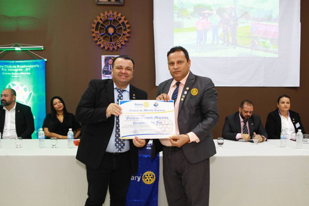 9) Na sequência, o Governador Assistente 2021-2022, Reinaldo Alves De Aguiar, representando o Governador do Distrito 4440 ano rotário 2021-2022 Zozoel De Paula fez a entrega de uma honraria do Distrito 4440 ao companheiro Presidente Girleno Gomes Moreira em reconhecimento aos trabalhos realizados frente ao Rotary Club de Rondonópolis-Rio Vermelho e socidade rondonopolitana.
