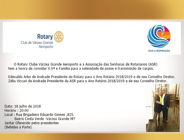 Convidamos a V.s para a Solenidade de Posse e Transmissão de Cargos do Rotary Clube Várzea Grande Aeroporto Ano Rotário 18/19 juntamente com ASR ( Associação de Senhoras de Rotarianos).