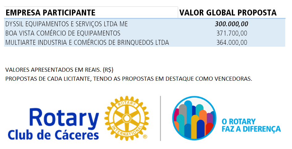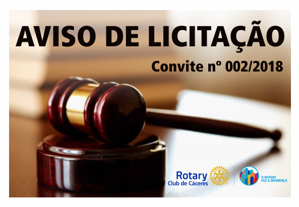 ROTARY CLUB DE CÁCERES, no uso de nossas atribuições legais, torna público para conhecimento dos interessados que a licitação na modalidade de CONVITE, para Aquisição de 20 (VINTE) APIs com 10 Equipamentos em cada, para serem instaladas em praças e outros logradouros públicos na região Oeste de Mato Grosso, com supervisão do Rotary Clube de Cáceres, sendo 12 (DOZE) no município de Cáceres e as demais nas seguintes cidades; Araputanga; Glória D’Oeste; Jaurú; Mirassol D’Oeste; Pontes e Lacerda; Porto Espiridião; Rio Branco e São José dos Quatro Marcos. Foi realizada hoje (05/07/2018) conforme programado, às 9h, na sede do ROTARY, cito a Rua 13 de Junho 339, Bairro Centro, Cáceres-MT. Estiveram presente os Presidentes GILMAR BATISTA MAROSTEGA e JORGE ANTÔNIO RODRIGUES, além de Associados do ROTARY CLUB DE CÁCERES, bem como o representante da empresas DYSSIL EQUIPAMENTOS E SERVIÇOS LTDA ME e BOA VISTA COMÉRCIO DE EQUIPAMENTOS.