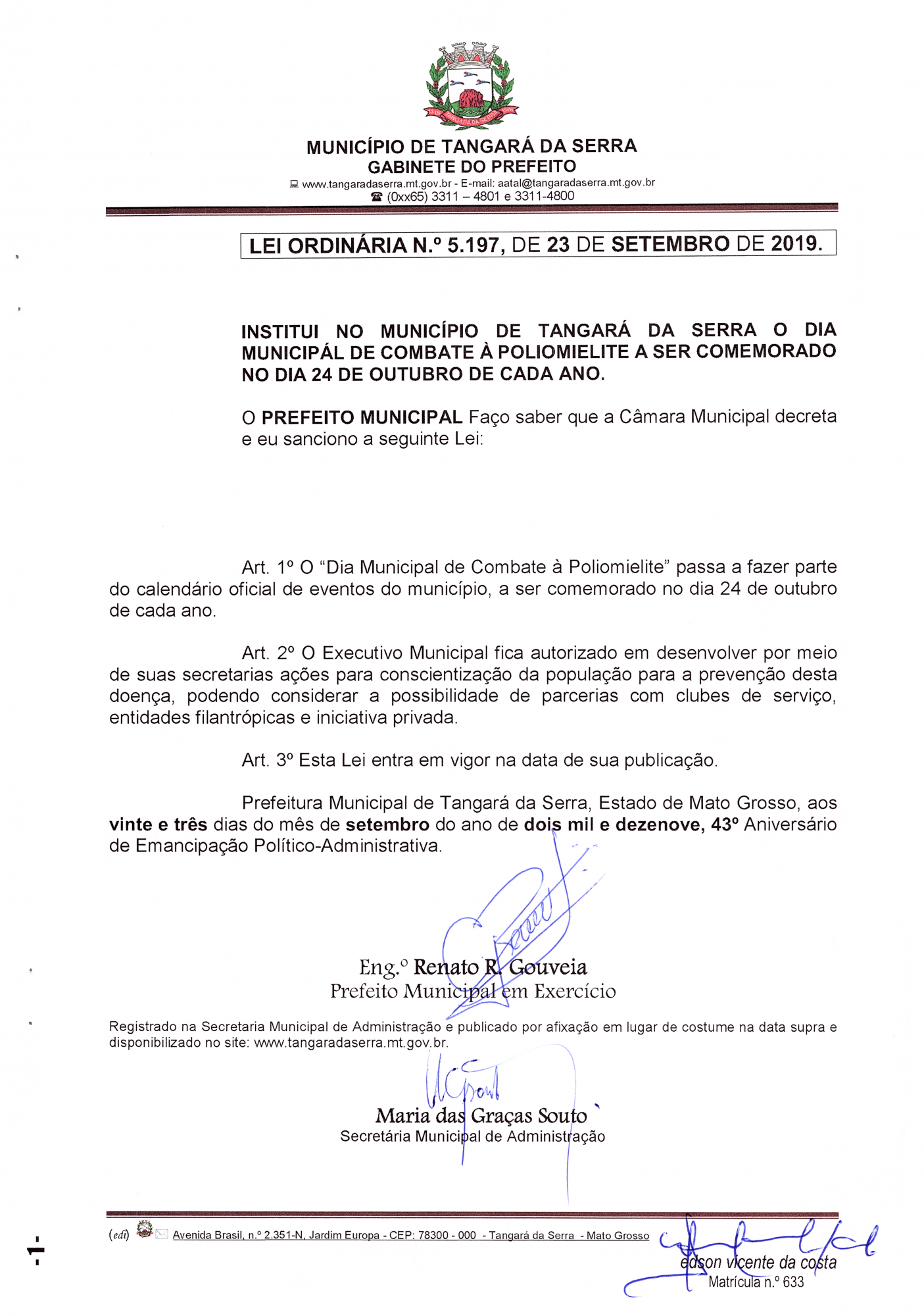 A pedido dos associados do Rotary Club Tangará da Serra a Camara municipal decretou e o prefeito em exercício, Renato Gouveia, sancionou a Lei Ordinária nº 5.197 de 23 de setembro de 2019. Que institui no município de Tangará da Serra o dia municipal de combate à poliomelite a ser comemorado no dia 24 de outubro de cada ano.
