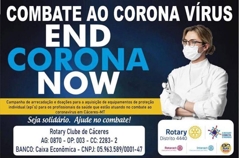 Com o crescimento de casos de contaminação no Estado e sabendo que Cáceres é cidade polo da saúde na região, o Rotary Club de Cáceres pautado na missão de servir, lança a Campanha End Corona Now, que visa a aquisição de Equipamentos de Proteção Individual (EPIs), para doação aos hospitais da cidade, uma vez que a demanda desse material será enorme e, é essencial no controle da disseminação aos profissionais da saúde.